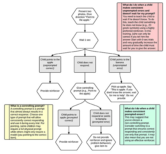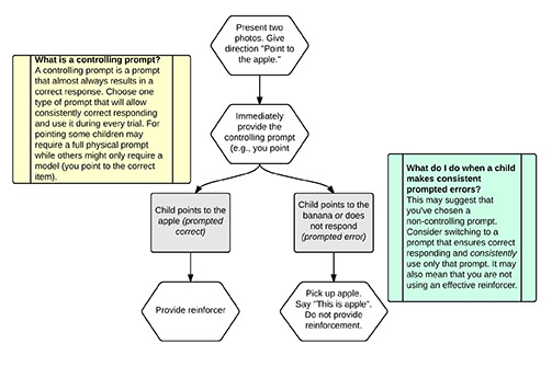 - If the child doesn’t respond, she shows the child the correct picture. When the child touches the apple, the adult provides reinforcement (Prompted Correct).